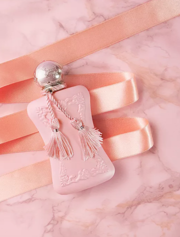 Delina by Parfums de Marly captivates with its lush, floral bouquet accented by rhubarb and lychee.