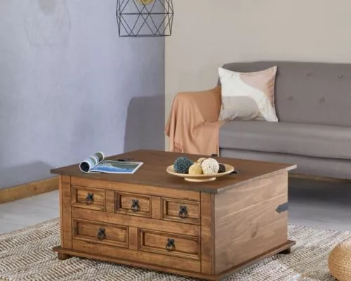 The IDIMEX rectangular coffee table exudes rustic charm with its solid pine construction and rich brown finish. Inspired by Mexican craftsmanship, it offers a sturdy design and hidden storage beneath its lift-top feature. Perfect for cozy living rooms, this piece brings warmth, practicality, and a touch of traditional elegance to any modern interior setting.